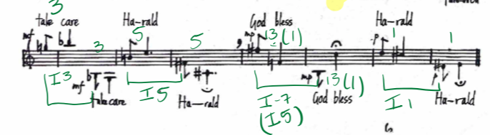 A notable part of the piece is in the second act with the only women in the show. The soprano sings into two different registers to portray singing a duet; they perform a series of inverted intervals. First, one wife sings G#5 down to C5, and the other responds with A3 up to F4. Both intervals have a span of 8 semitones. Next, they sing inverted intervals spanning 6 semitones. As the sequence continues, there are a few instances during which the span of semitones is the same amount of semitones as the inverted transposition.